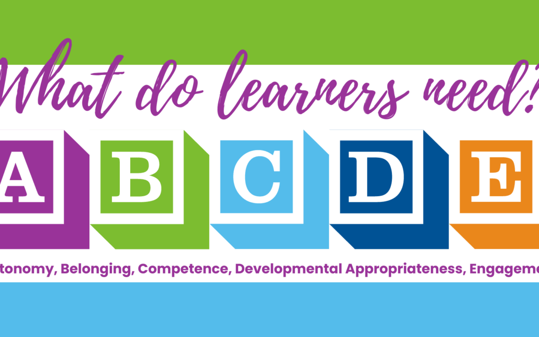 In this activity you will introduce students to a tool Inspired Teaching created called the ABCDE of learner needs which teachers, and students, can use to evaluate where their needs are and aren’t being met.